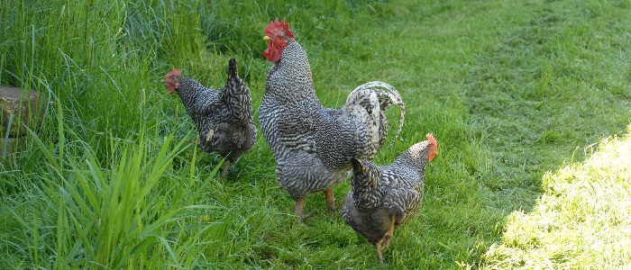 Finally last weekend I was sitting on their stoop holding the old henny (the one that lived in the greenhouse all winter) when the rooster came out of the yard. For the first time he didn't just go running off; he circled back around, cocked his head, and gave the situation a good look. Clearly he didn't think it was appropriate for me to be holding a hen, and he didn't much like it. He evaluated his options... and ran off to jump on one of the young hens who was standing around! That was a little bit of a surprise to all of us... me, him, and definitely the hen!